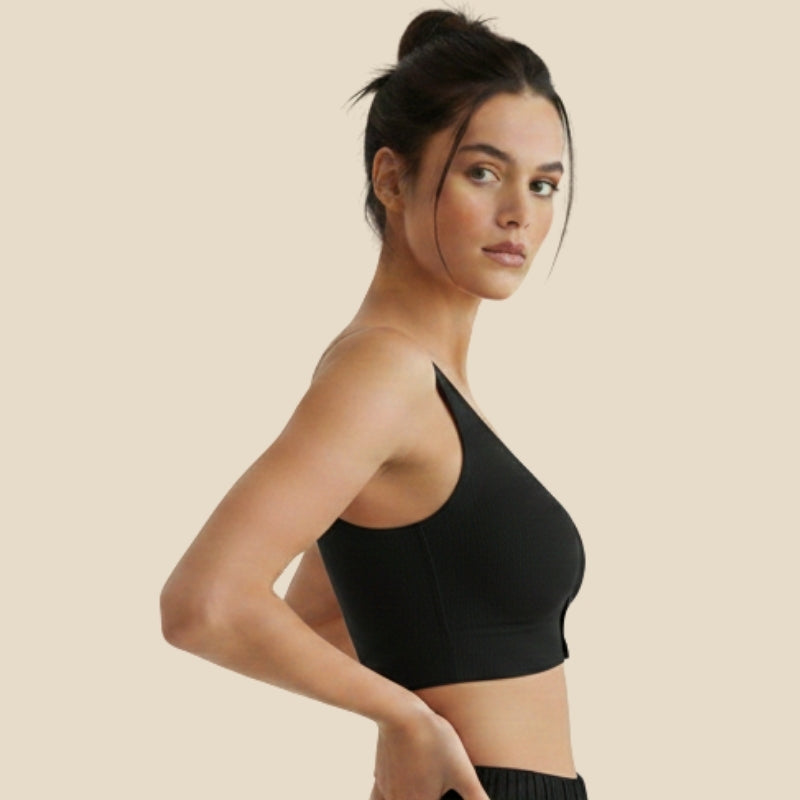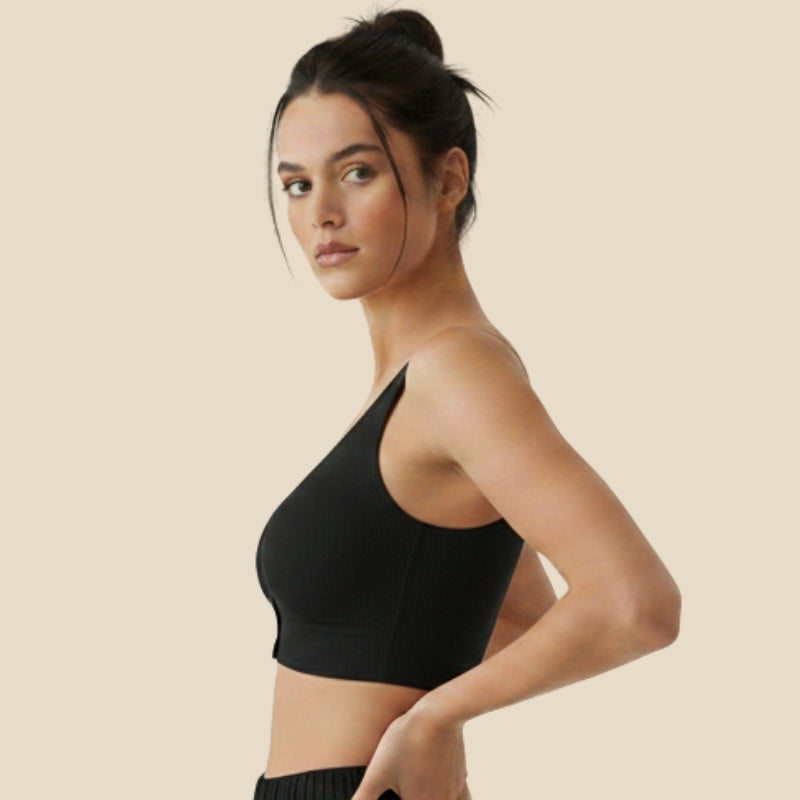 Functional Comfort: This front-closing wireless bra features a soft, ribbed texture and a button-down placket for effortless dressing and a flexible, supportive fit.
