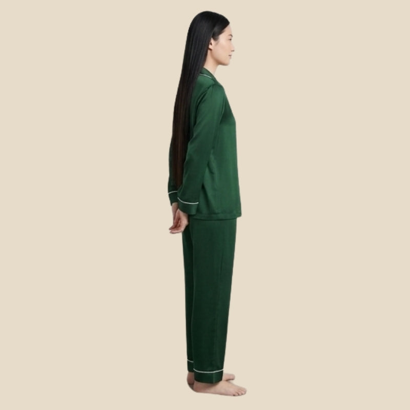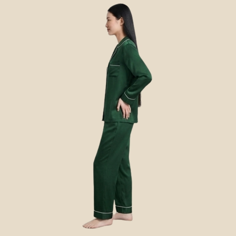 The classic silhouette is elevated with contrast piping details, adding a polished touch that enhances its luxurious aesthetic. With its smooth finish and graceful drape, the set offers a sleek, elegant look while ensuring exceptional comfort for restful nights and relaxed evenings.