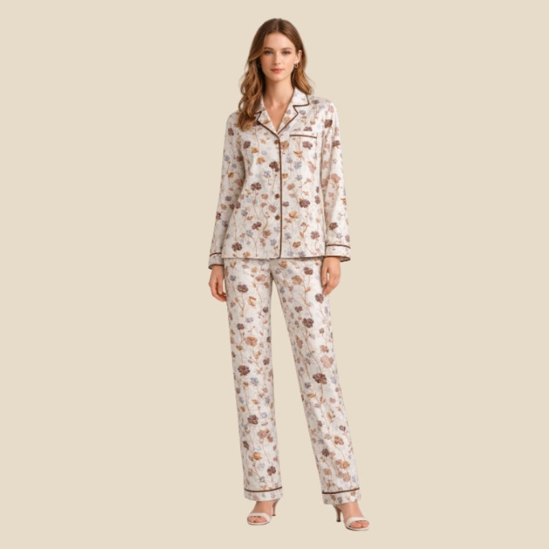 Designed with a tailored notched collar and delicate contrast piping, the set offers a polished, heritage-inspired look that feels both graceful and luxurious. The soft printed fabric drapes comfortably on the body, creating a relaxed yet elegant silhouette perfect for unwinding in style.